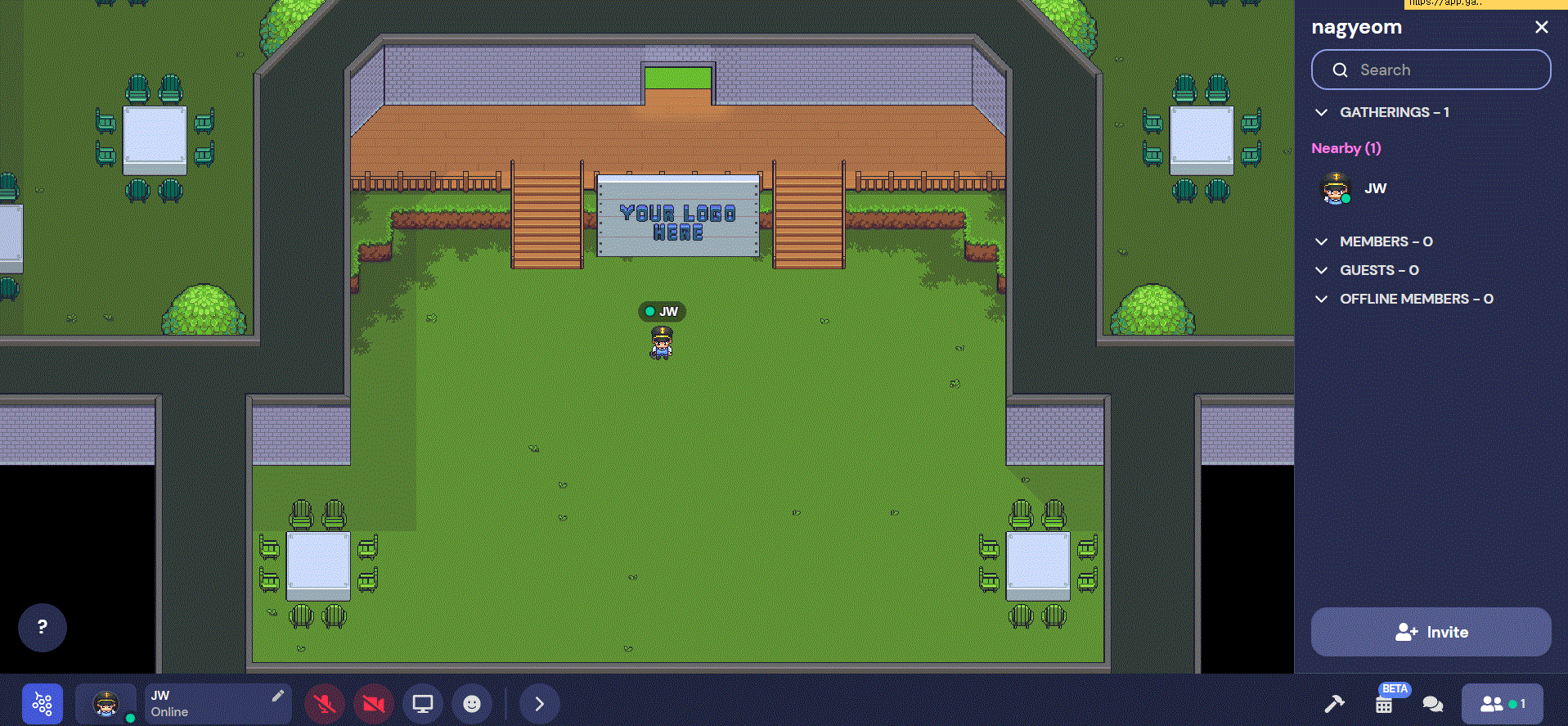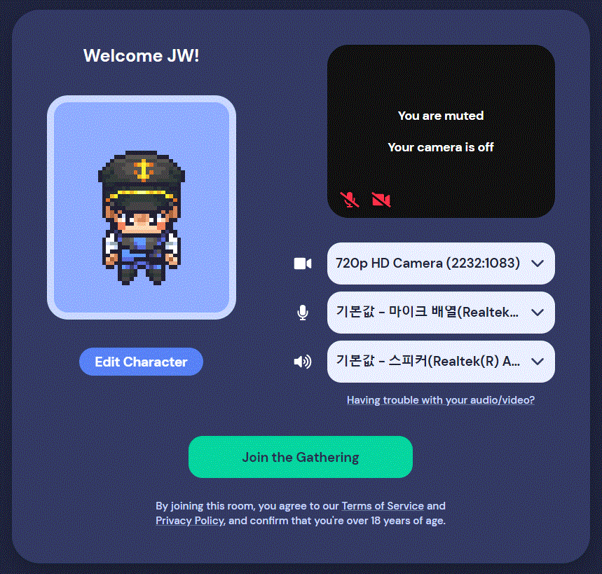 : https://www.gather.town/ 에 입장하면 아래와 같은 화면이 나옵니다.