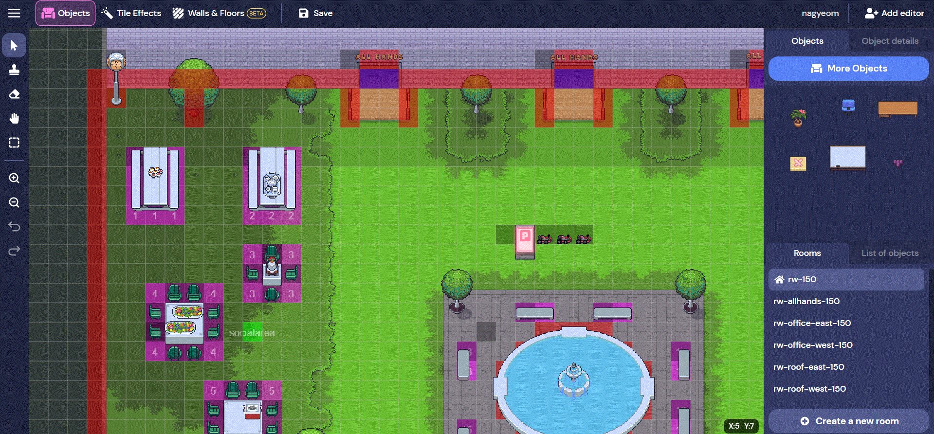 9. 여기서, 가장 좌측상단의 메뉴버튼을 눌러 'manage space 클릭' -> 이동된 페이지 Space dashboard에서 'edit space를 클릭'하면 mapmaker로 이동되며, 오브젝트나 각종 이펙트, 벽과 타일 등을 직접 편집할 수 있습니다.