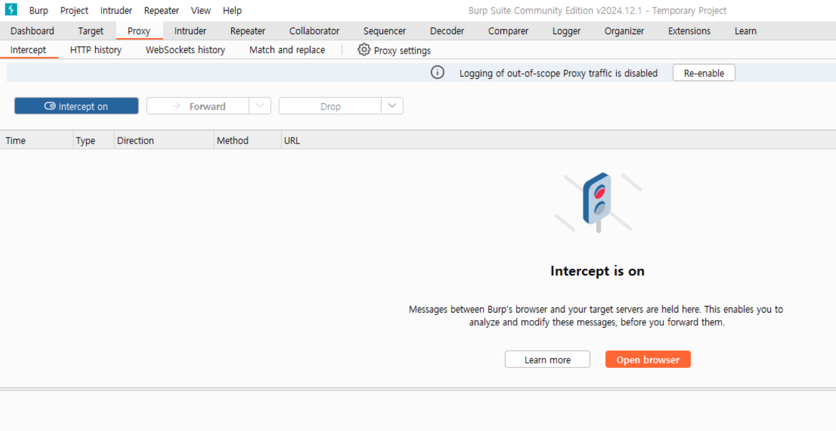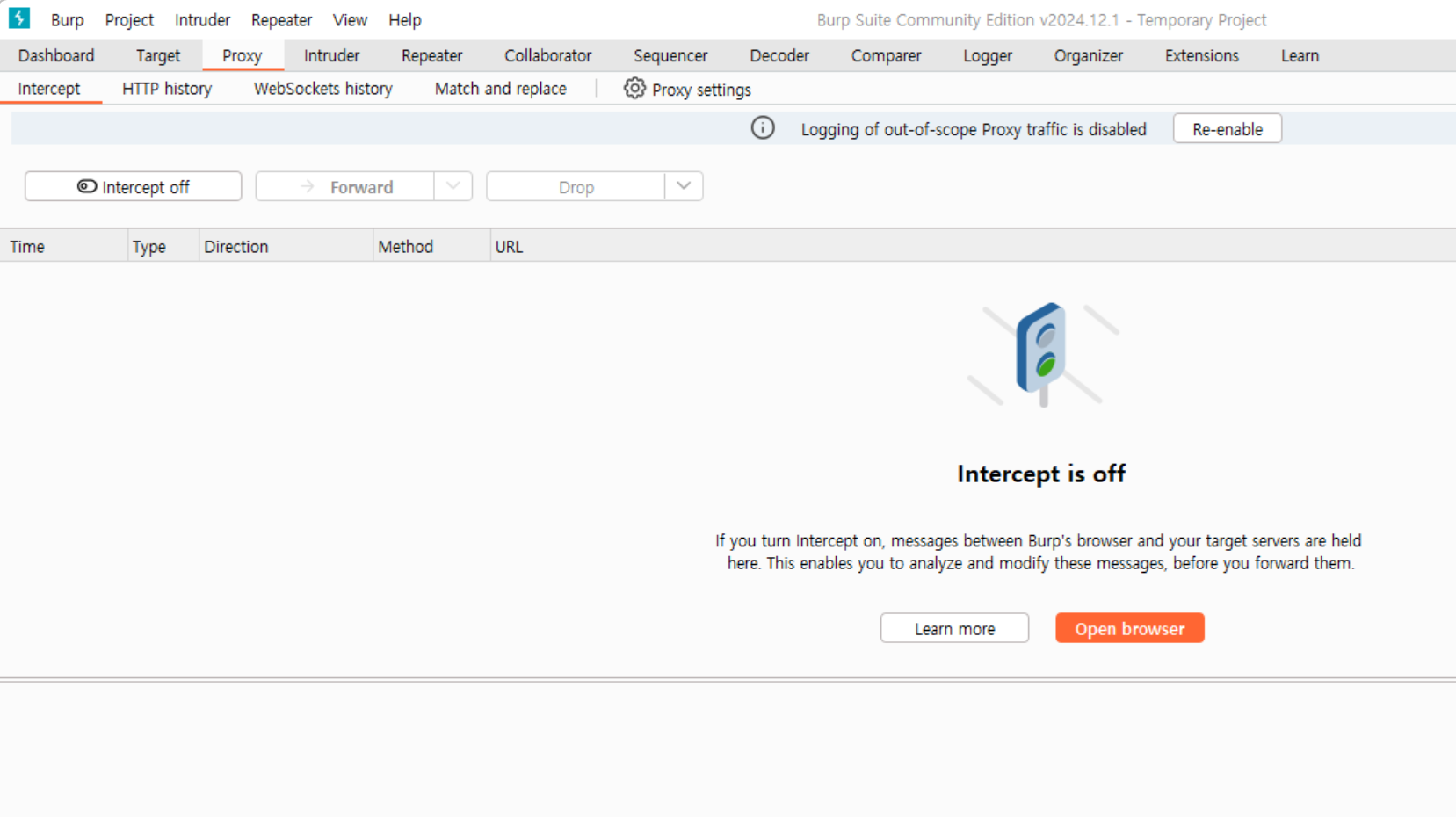 1. intercept off 의 상태에서, 아래 open browser를 클릭하여 새 브라우저를 연다.