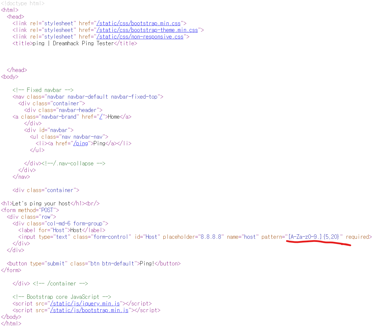 이제 다시 home으로 와서, 위조된 명령어를 삽입해보려고하니 형식일치 내용이 나오길래, ctrl+U로 소스코드를 확인해주니 패턴이 나옵니다.