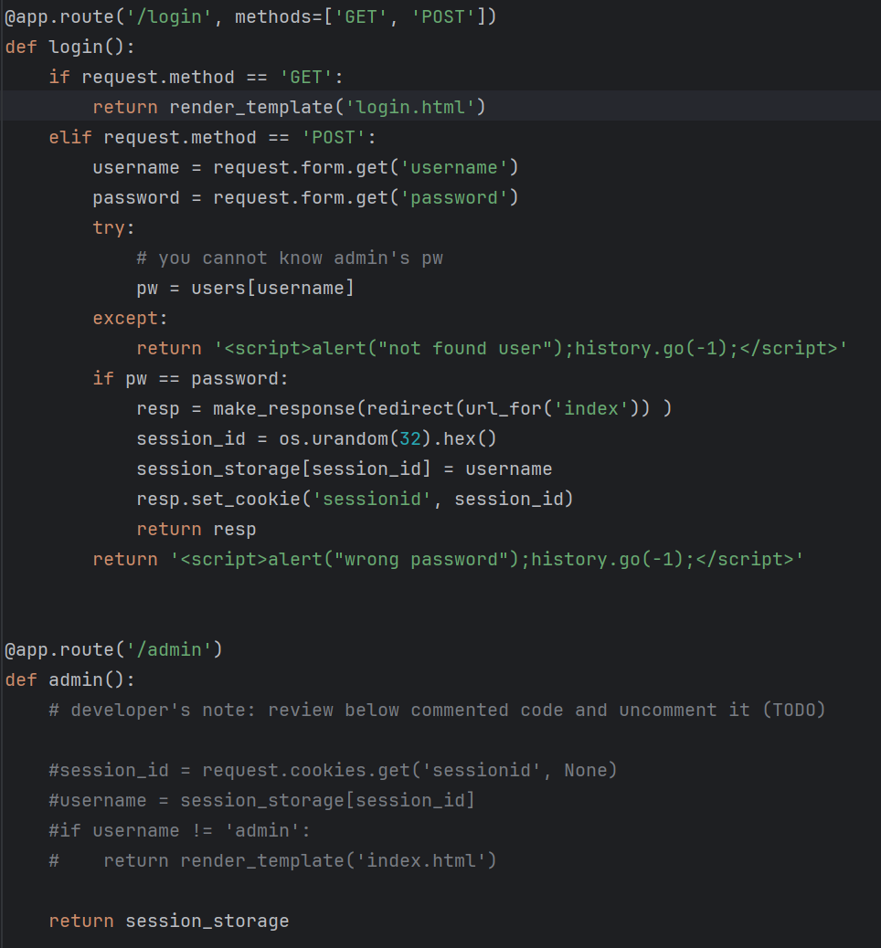 admin 함수에서는 session_storage의 값을 반환해주는 것을 확인할 수 있습니다.