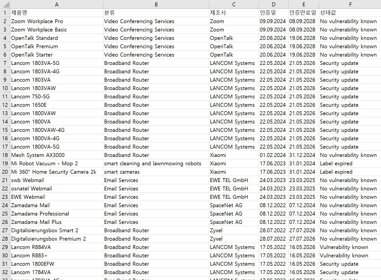 sheet.append(["제품명", "분류", "제조사", "인증일", "인증만료일", "상태값"])